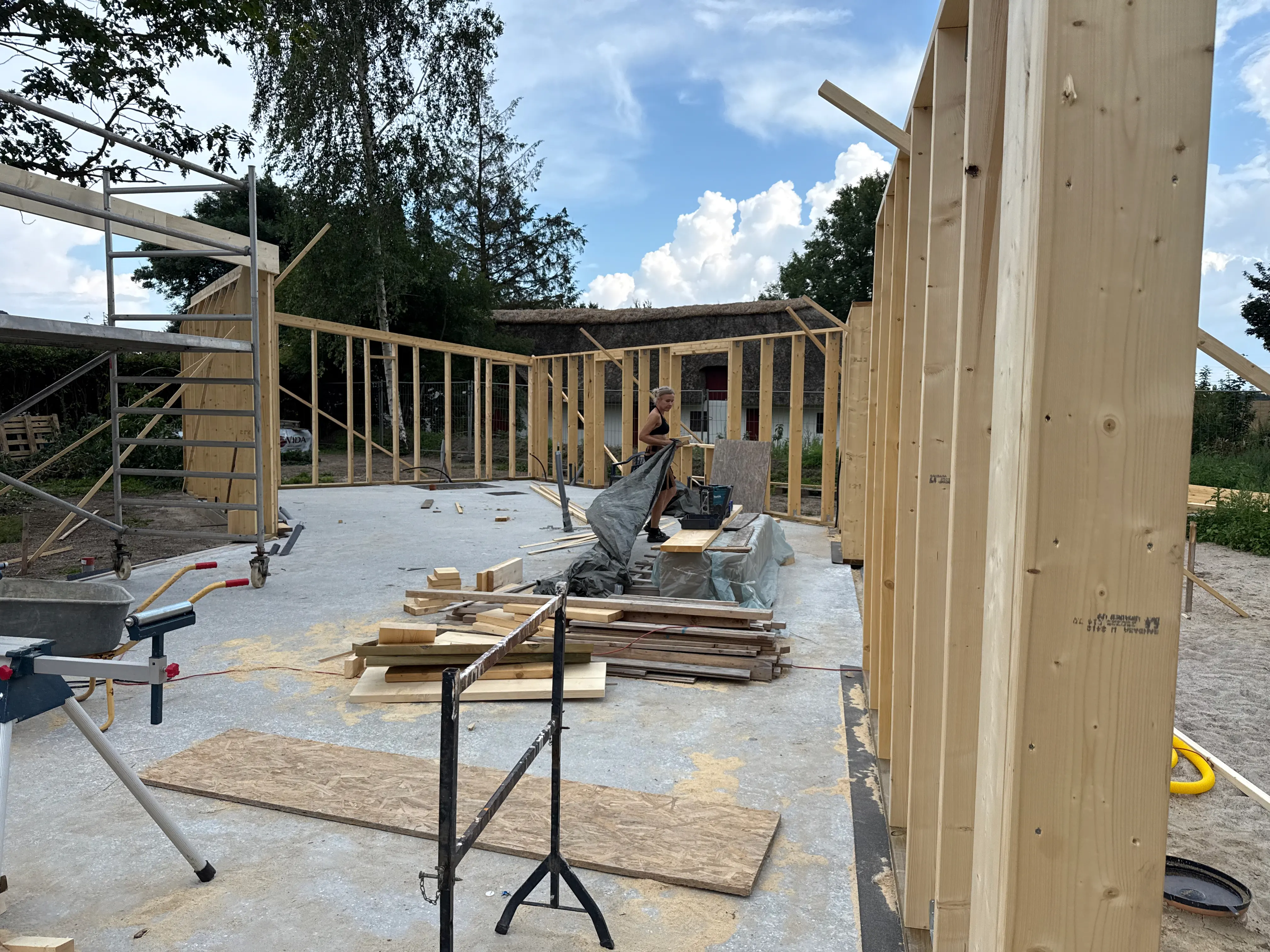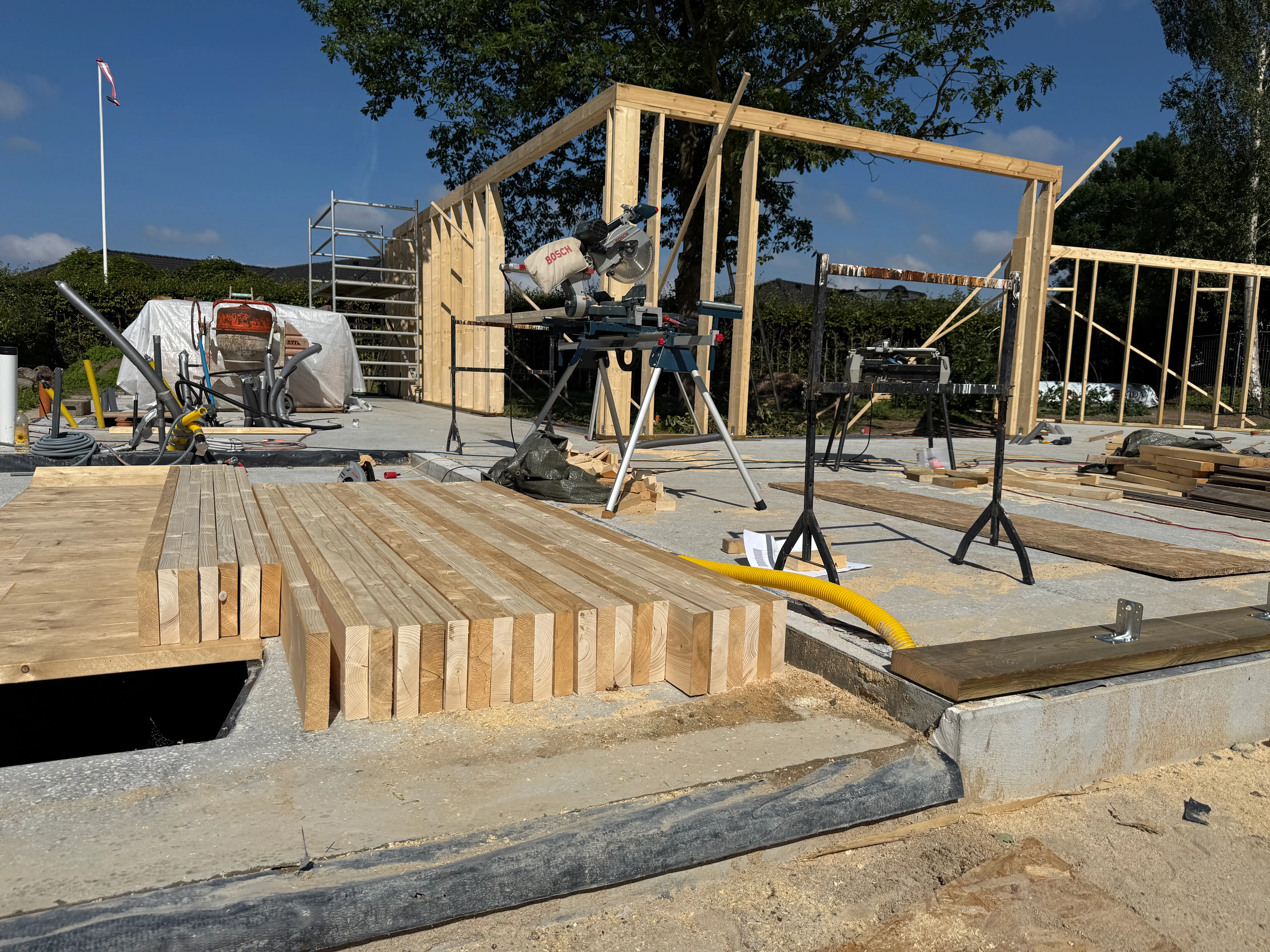 Så blev det endelig tid til at lave TRÆ-skelettet. Det er fantastisk at opleve de første 3D-strøg, at gå inde i huset og f.eks. se udsigten ud af hullet til køkkenvinduet. Lars er i sit es som tømrer og jeg som lærling, der skruer skruer i.