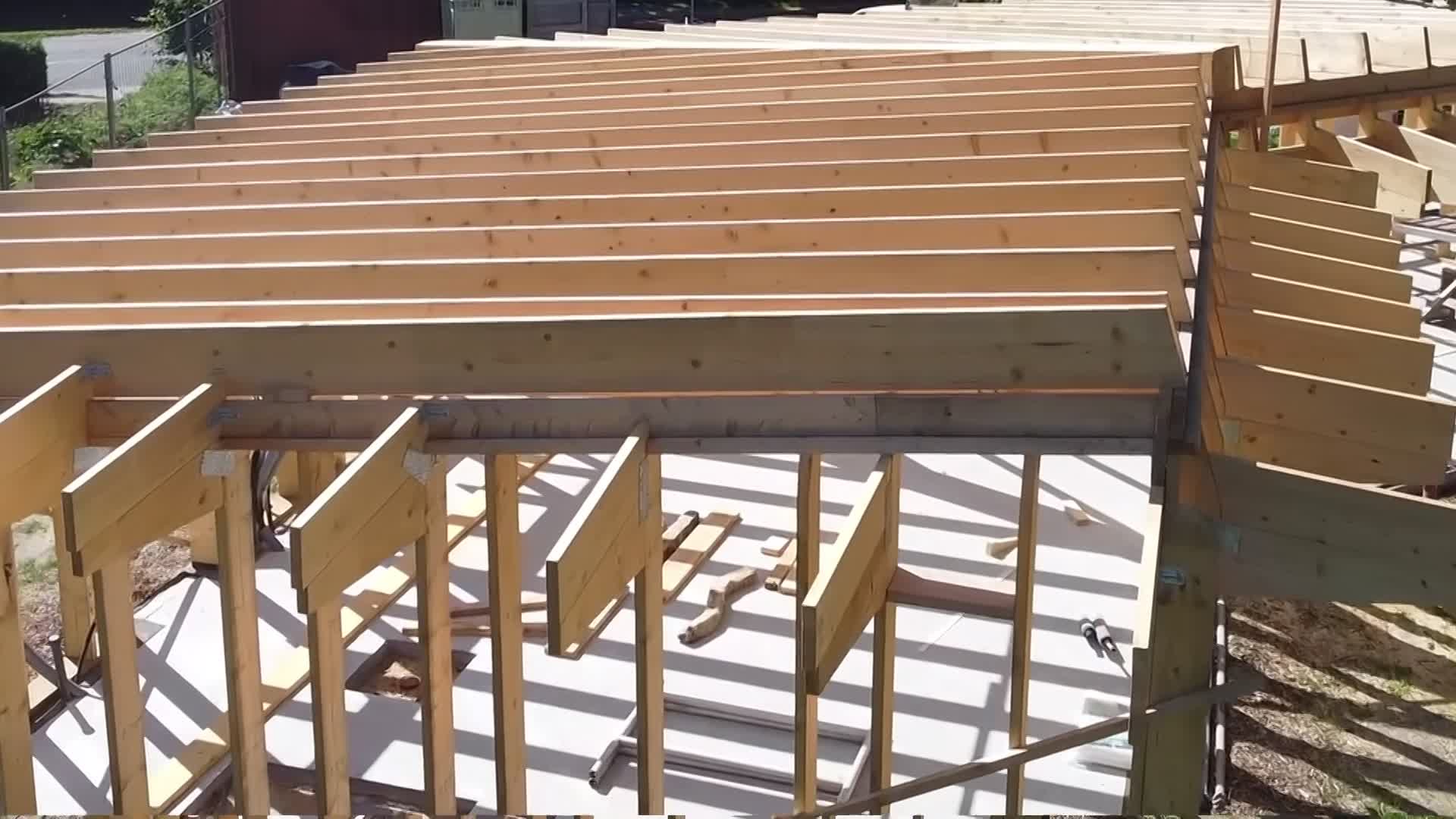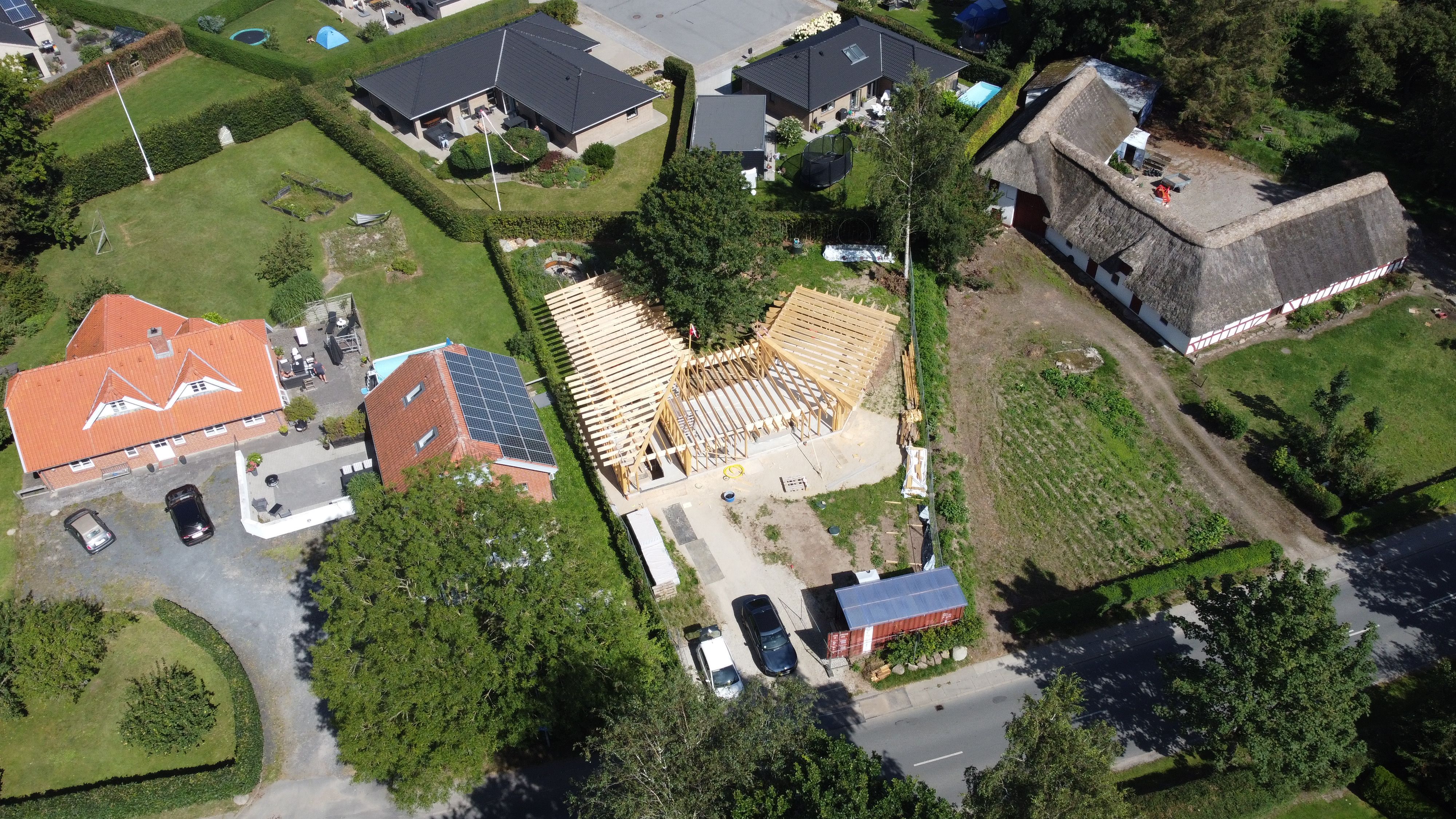 Nedenfor en flyvetur hen over de færdige spær. Tak til Viktor for at være dronepilot.