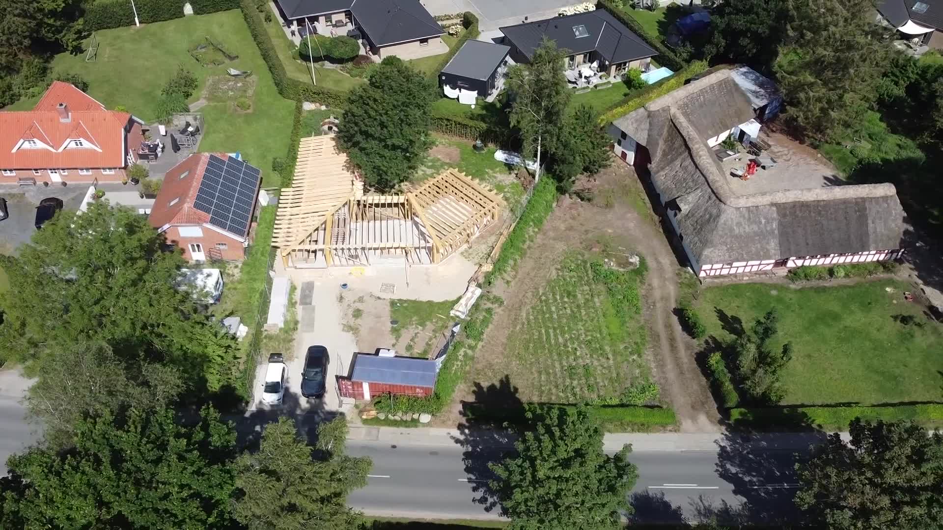 Syn for sagen med huset under egen – her nedenfor dronevideo, der viser huset og det færdige resultat med alle spær oppe samt grundens placering i forhold til naboer.