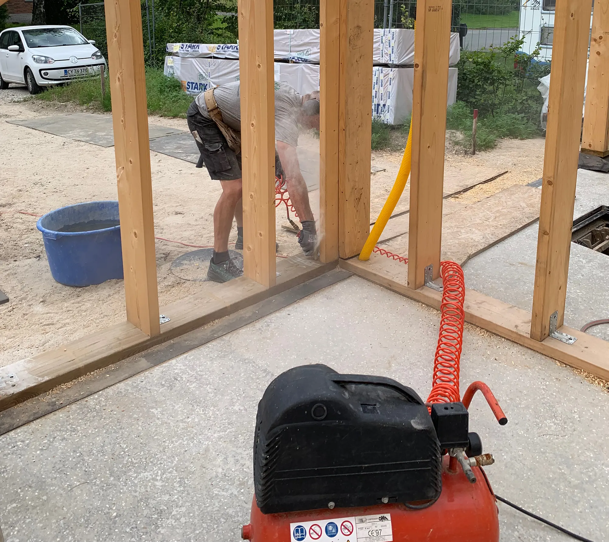 Nu er alle spær oppe, hvor der ikke indgår limtræ, så de store dragere venter vi på, og er lige om hjørnet.
