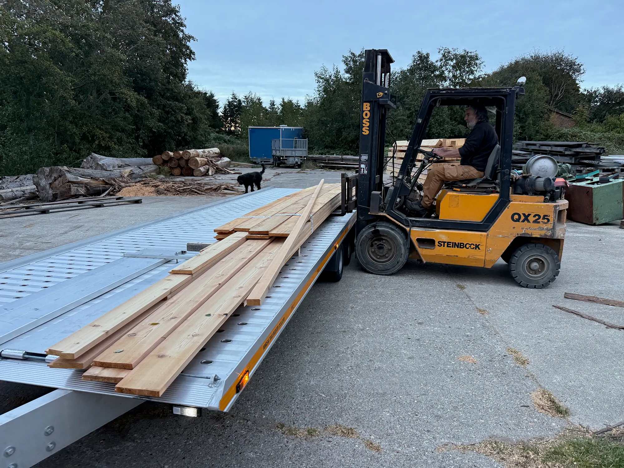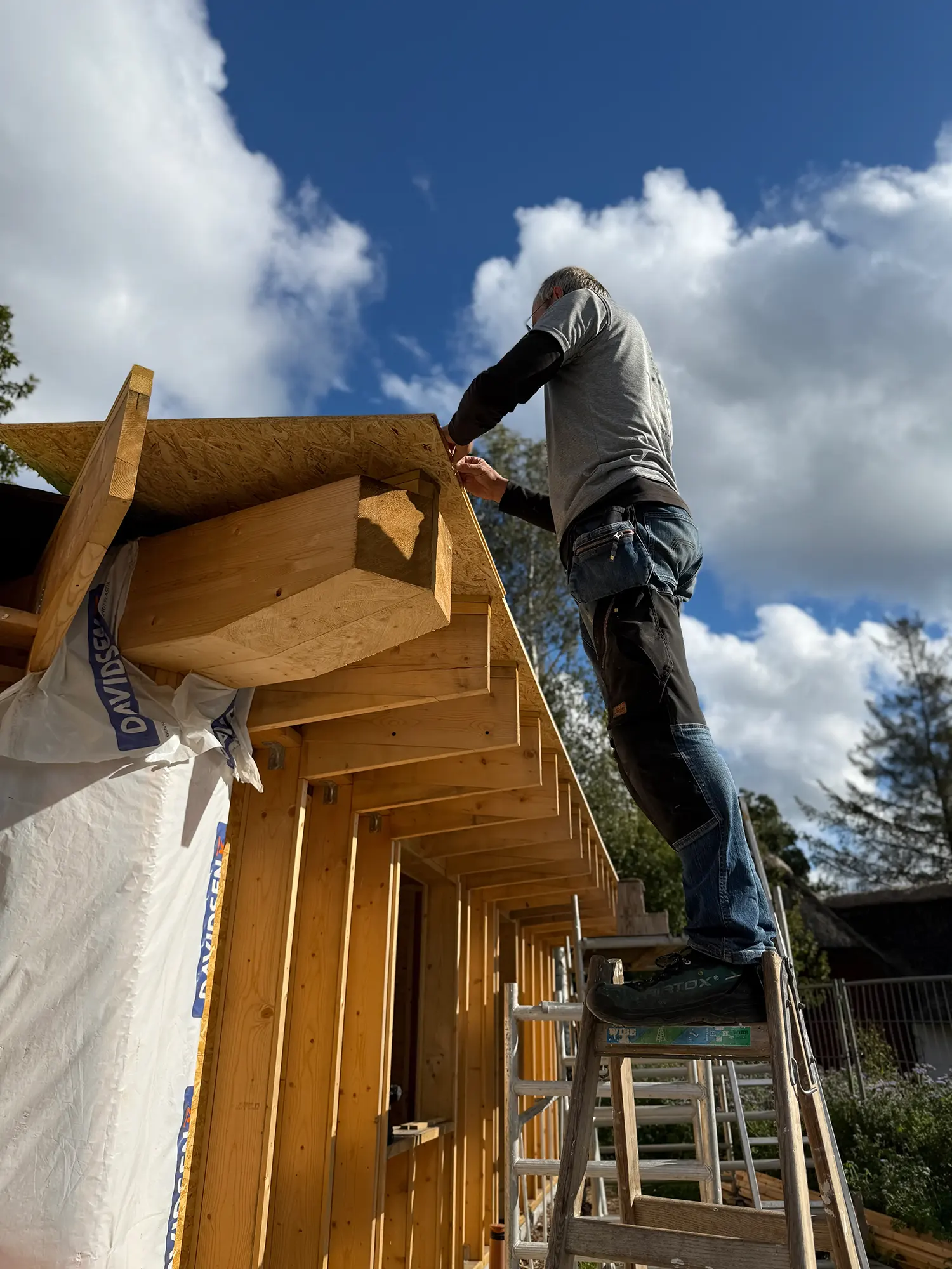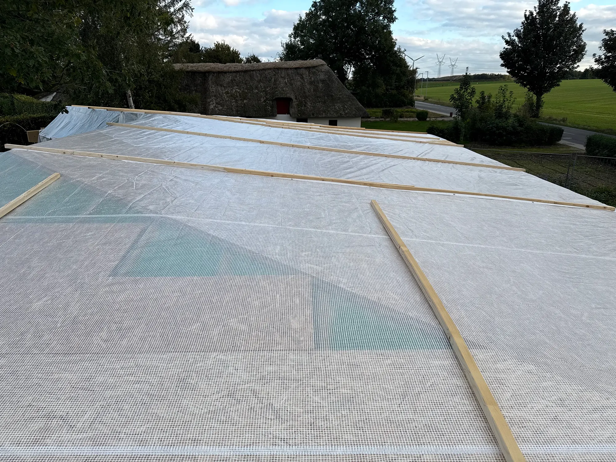 Taget udgøres af 18 mm OSB-plader og med stern af thuja sternbrædder fra Hemmerslev Træ som er blevet hentet hjem på måske danmarks længste trailer 10,5 m total.