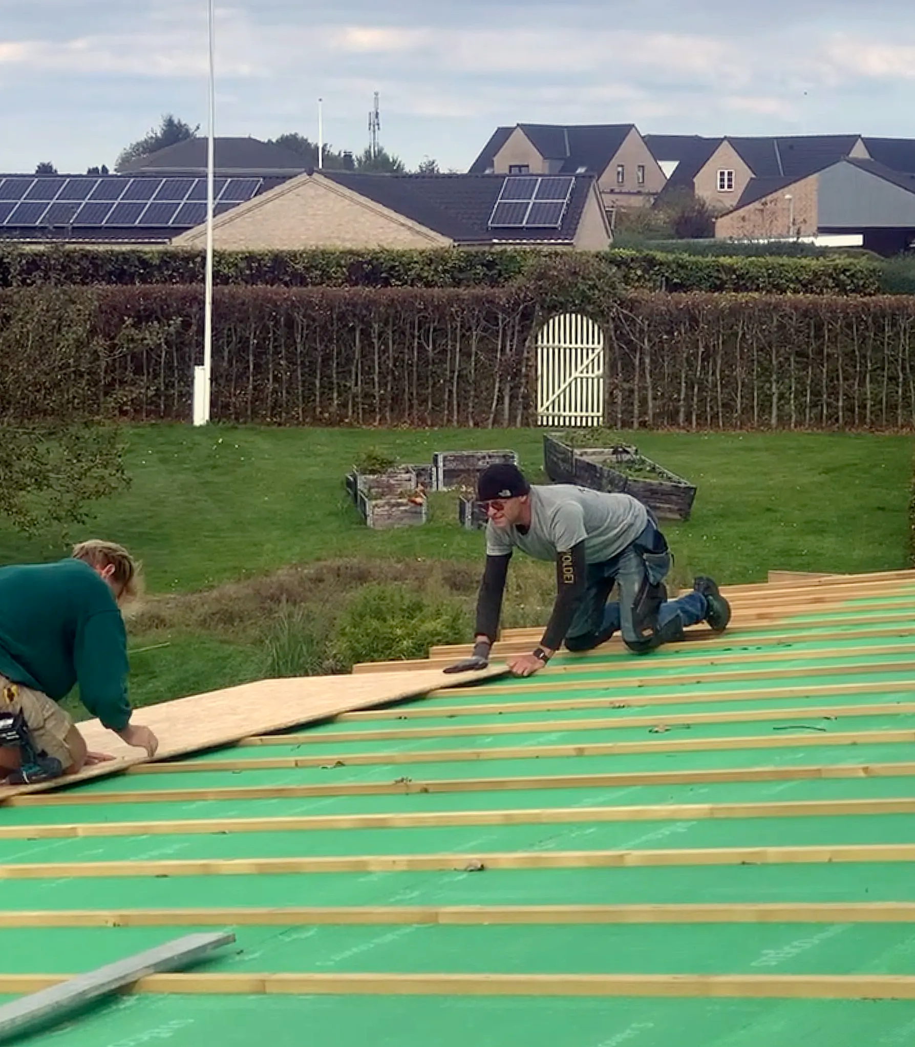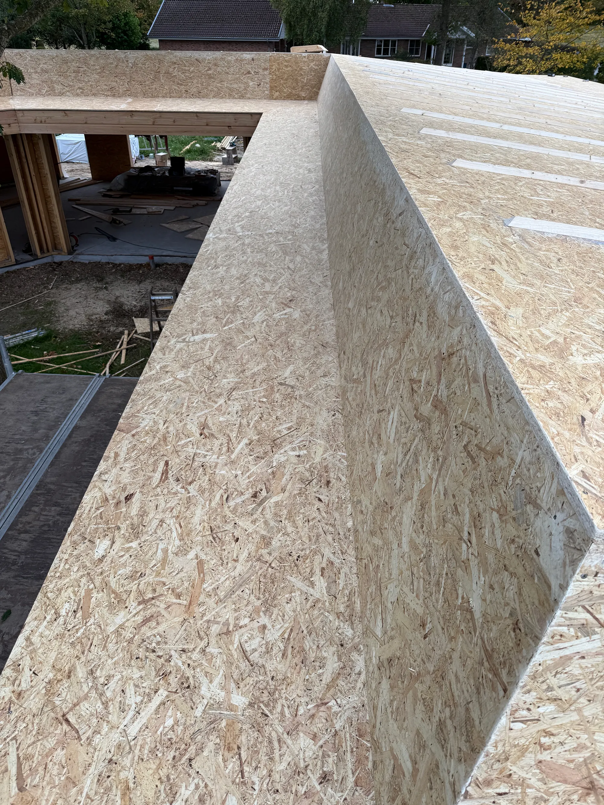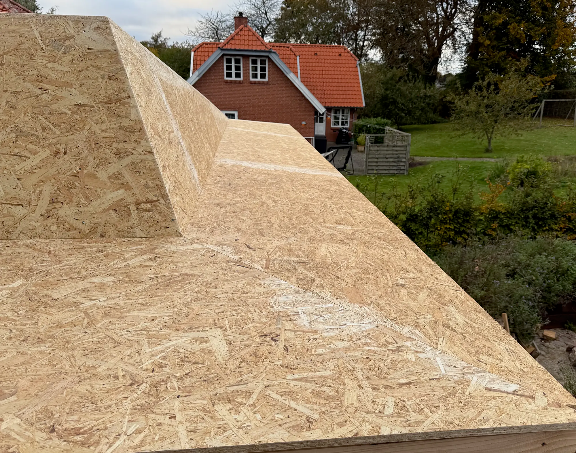 Taget udgøres af 18 mm OSB-plader og med sternbrædder af thuja fra Hemmerslev Træ, og de er blevet hentet hjem på måske Danmarks længste trailer 10,5 m total.
